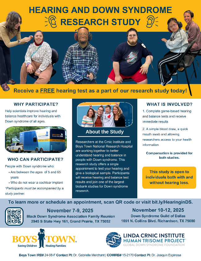 The Linda Crnic Institute for Down Syndrome (Crnic Institute) and Boys Town National Research Hospital (Boys Town) are partnering to offer FREE hearing tests as part of their Hearing and Balance in Down Syndrome Research Study. Participants will receive their hearing test results and be part of one of the largest Down syndrome biobanks in the world: The Human Trisome Project (HTP).