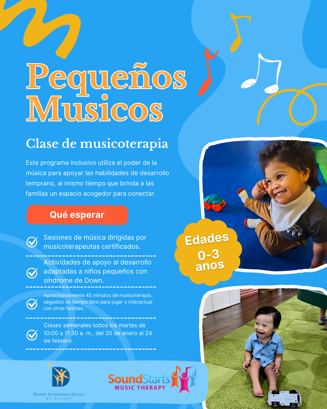 ¡Únase con nosotros cada semana para una atractiva serie de musicoterapia diseñada especialmente para los niños con síndrome de Down de 0 a 3 años! Este programa utiliza el poder de la música para apoyar las habilidades de desarrollo temprano y a la vez que brinda a las familias un espacio acogedor para conectar. Los hermanos de edad similar pueden asistir por una tarifa adicional.